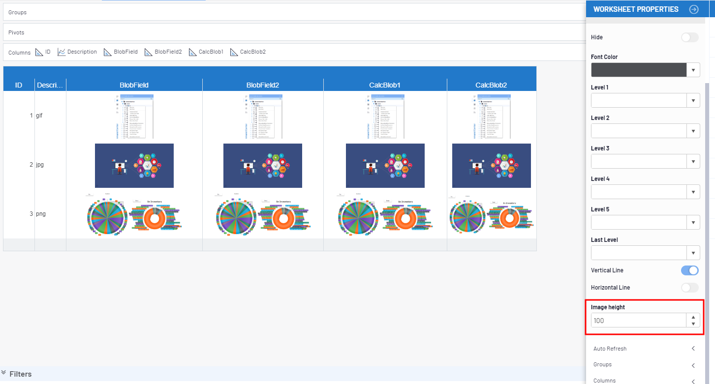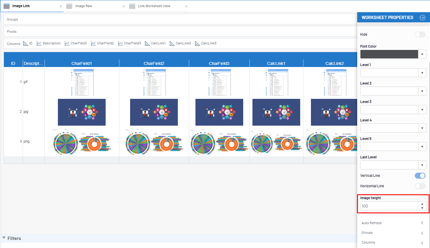 - Add the Image (RAW) fields and set up the Image Height in the Worksheet Properties ( click on