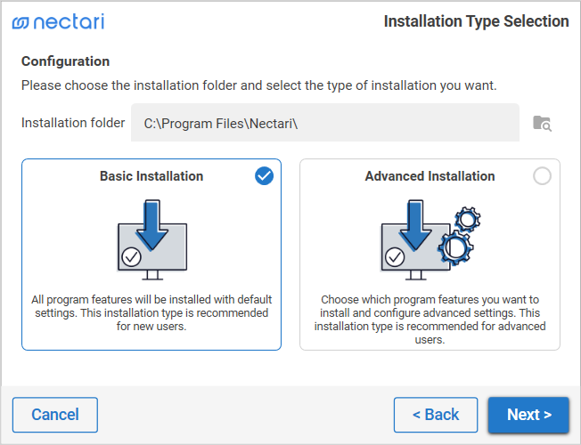This topic describes the steps to install the Nectari Server using the basic installation type. This installation type has fewer steps and is recommended for a simple architecture (single server or dedicated BI server). The server is installed with all its components (Application, Scheduler API, Distribution Worker and OLAP Worker). Nectari is installed in single-tenant mode by default.