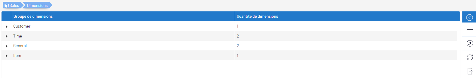 | Quantité de dimensions | Nombre de dimensions dans le groupe de dimensions. |