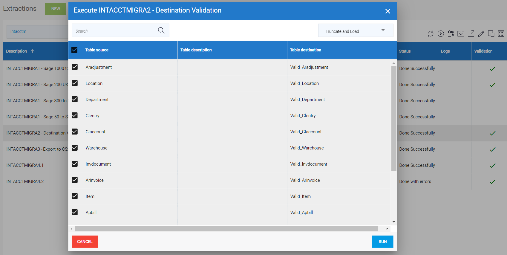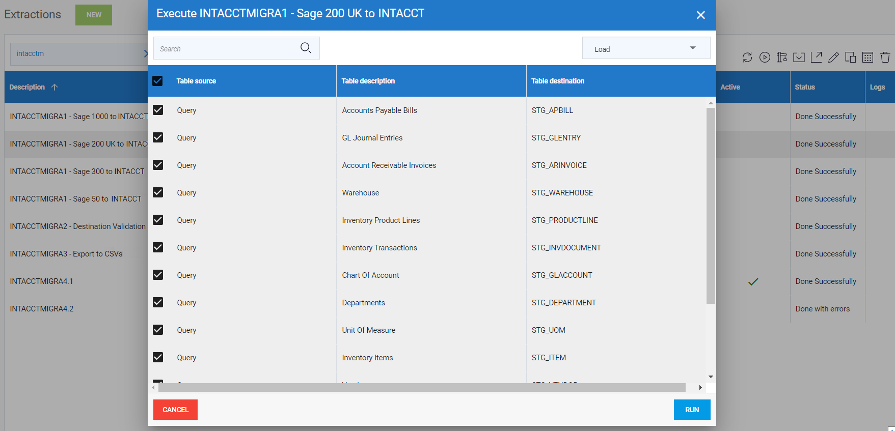 1. Exécutez l'extraction 1 créée dans Importer les extractions. La première extraction prend les données des tables sources de l'ERP et les envoient dans la table de Staging de Nectari.