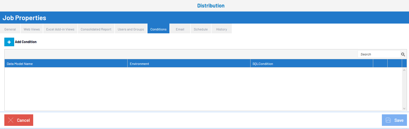 This tab allows you to add a condition to the Data Model where the View is extracted.