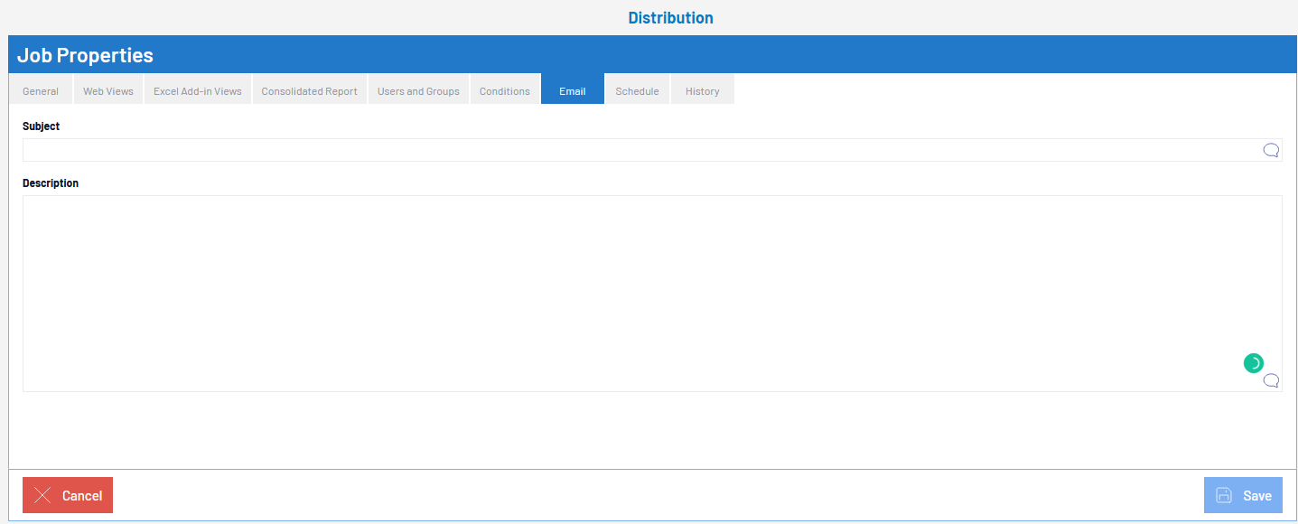 Use this tab to add a message (Description) and a Subject to the email sent by the Distribution.