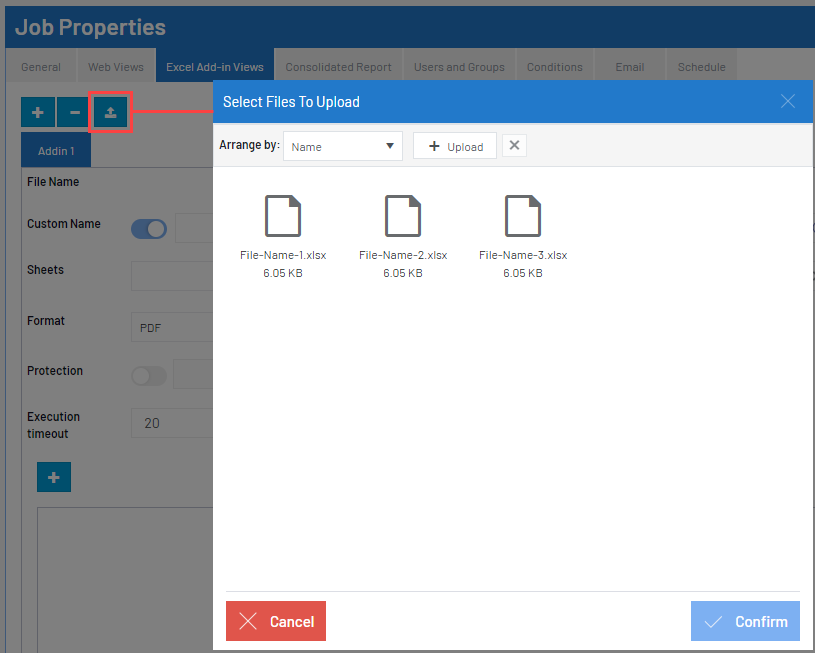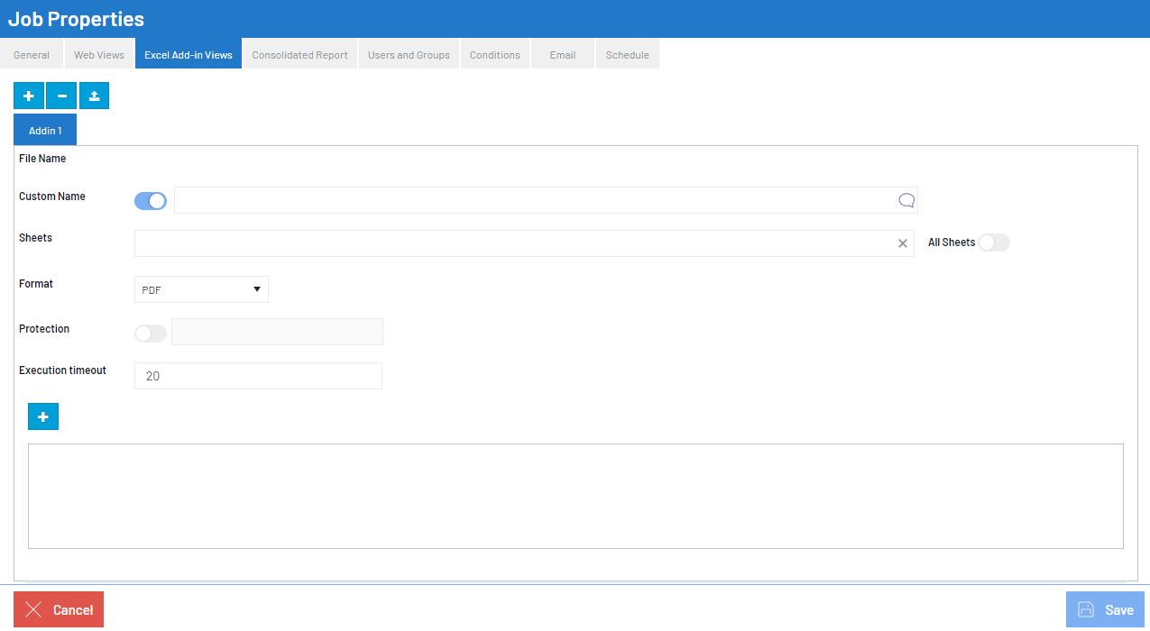 The Excel Add-in Views tab allows you to set up one or more Excel Files to be distributed during the Job execution.