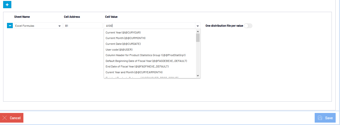 NoteIf you select Excel or Excel Add-In in the drop-down list, the Reporting Tree feature becomes available. When enabled, it replaces the one distribution file per value slider with one sheet per Reporting Tree node slider. The one sheet per Reporting Tree node slider will remove the Cell Value input column and generate Excel sheets based on the Nodes of the Reporting Tree you set as Distributable in the Administration section.
