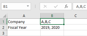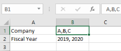It is possible to generate multiple files based on values separated by comma. For example, if you have an Excel file in which you have values regarding Companies and their Fiscal Years as shown below:![]()