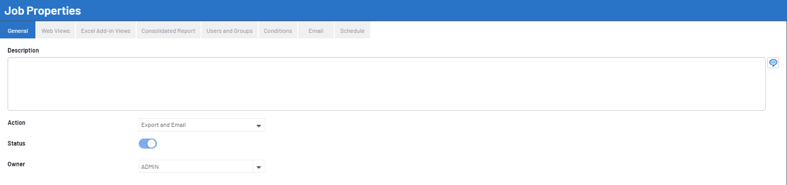 The General section for the Job Properties includes the Description, Action, and Status sections. This is where you can set and modify the most general settings for the distribution.