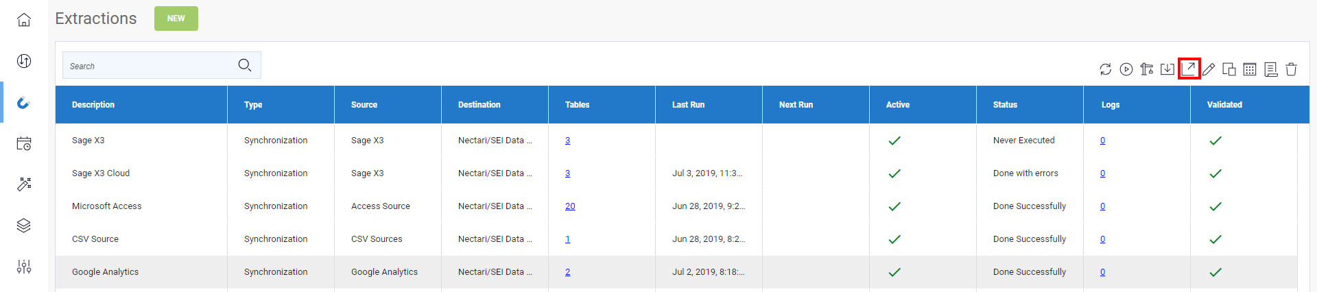 - Sélectionnez l'extraction dont vous voulez exporter ses paramètres dans la liste et cliquez sur l'icône Exporter une extraction située dans le coin supérieur droit.