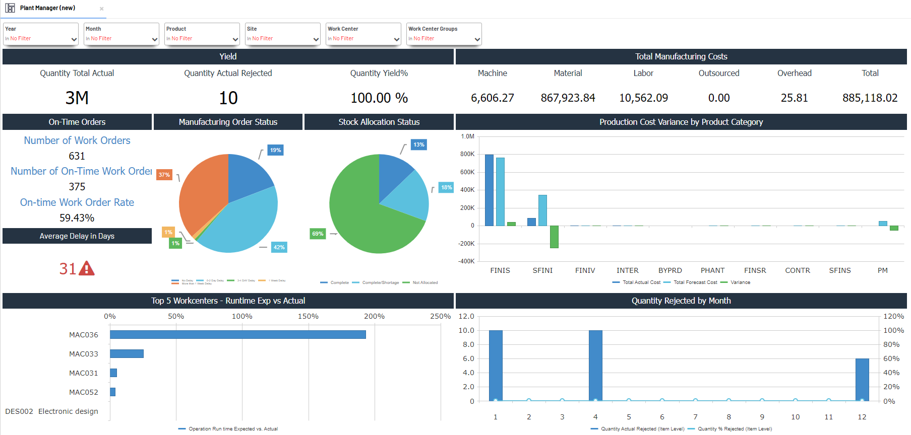Durée d'exécution des 5 principaux postes de travail par rapport à la durée réelle : cette section compare la durée d'exécution prévue pour les 5 principaux postes de travail à la durée d'exécution réelle. Cela peut aider le directeur de l'usine à identifier les domaines dans lesquels les processus prennent plus de temps que prévu et à rechercher les raisons de ces retards.