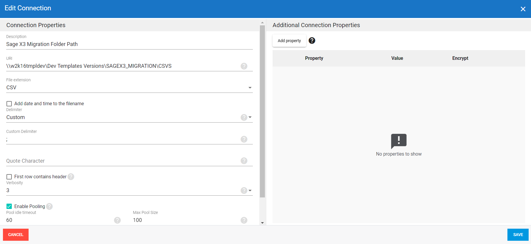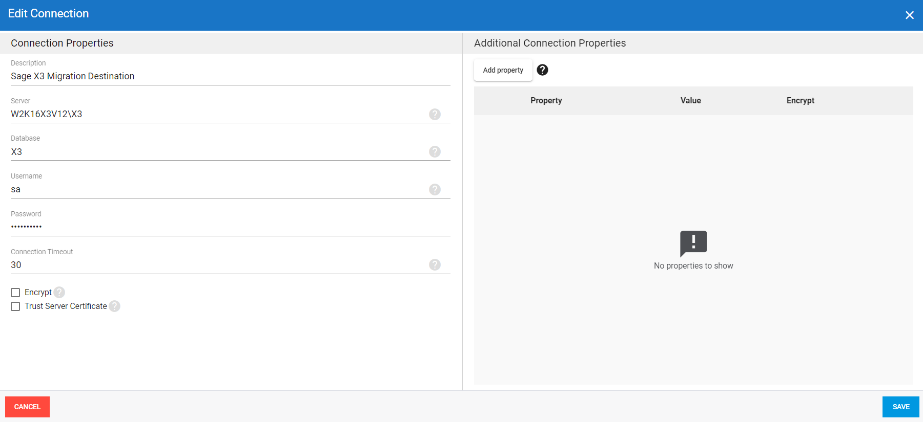 Vous devez créer trois connexions de destination pour la migration des données vers Sage X3 dans DataSync (voir Ajouter une connexion source et une connexion de destination pour plus de détails).