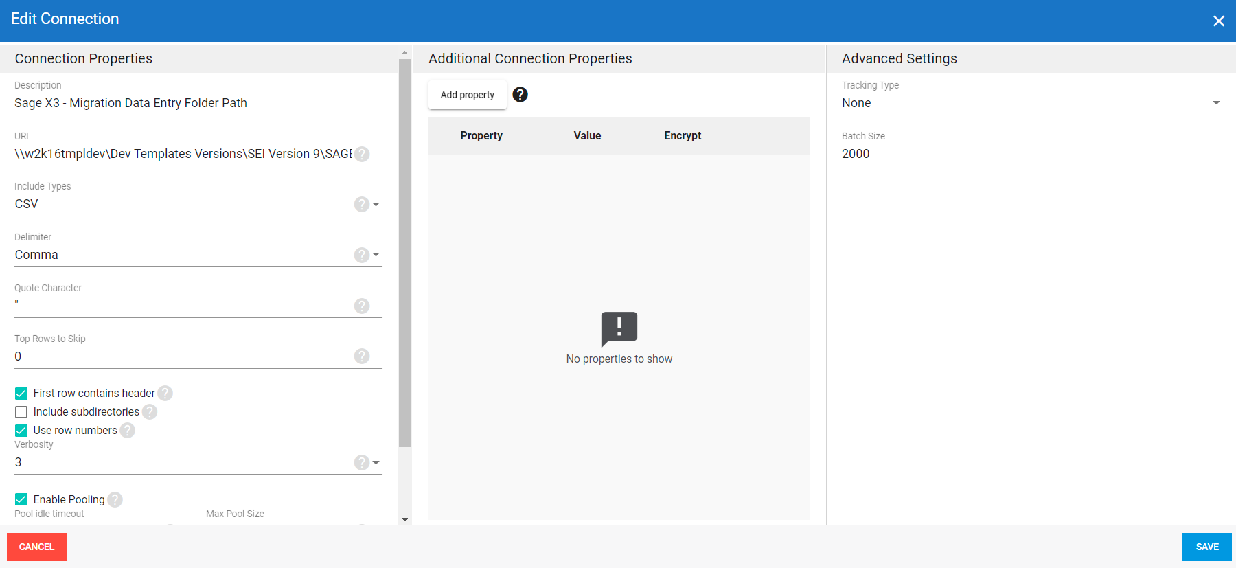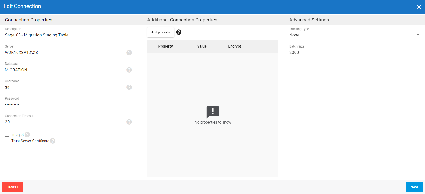 Vous devez créer quatre connexions sources pour la migration des données vers Sage X3 dans DataSync (voir Ajouter une connexion source et une connexion de destination pour plus de détails).