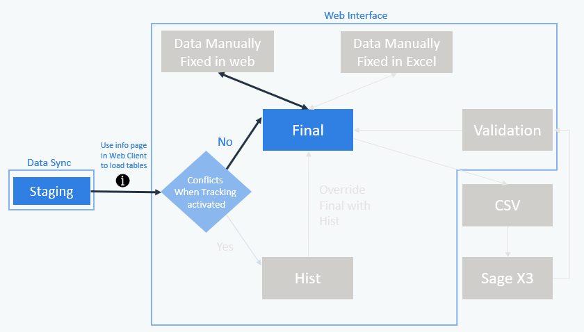 DataSync envoie d'abord les données des tables sources dans la table STG. Après avoir exécuté la page d'info, Nectari envoie les données de la table STG à la table FINAL lors du premier chargement. Pour les chargements suivants, vous pouvez choisir de mettre à jour la table HIST ou la table FINAL.