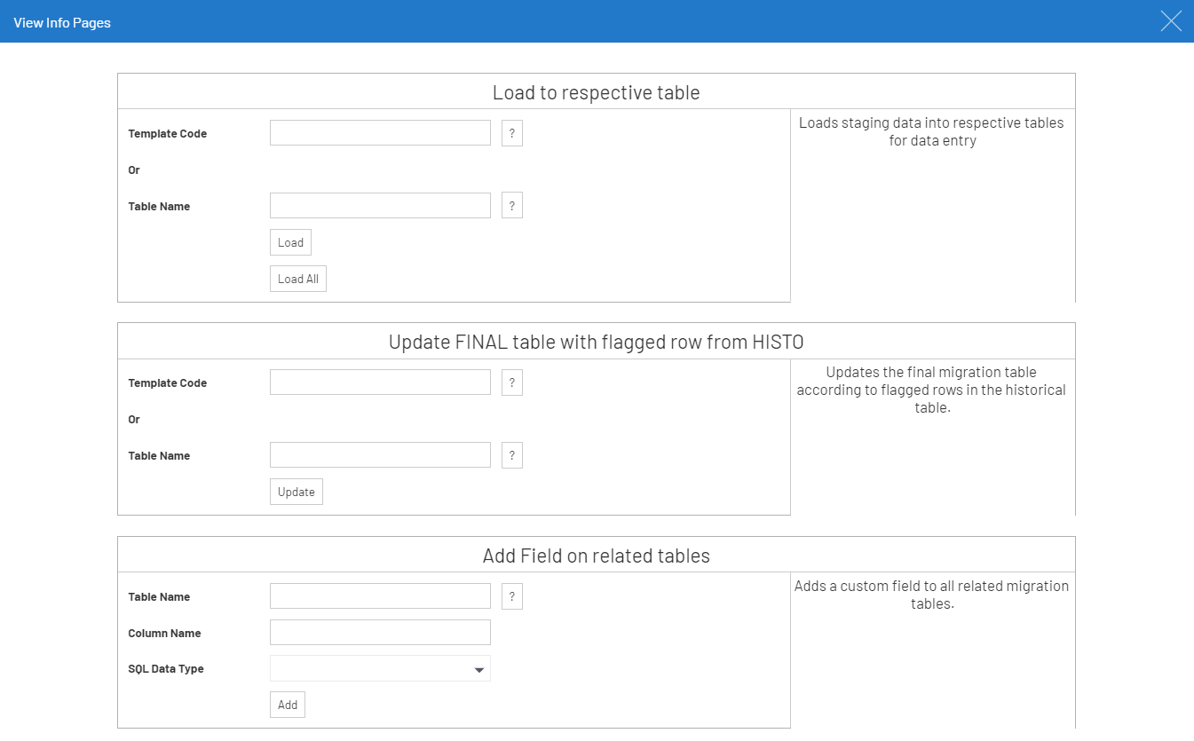 L'environnement de migration utilise une page d'info pour le modèle de données Load Data to FINAL and HIST Tables pour envoyer les données extraites de DataSync vers les différentes tables.