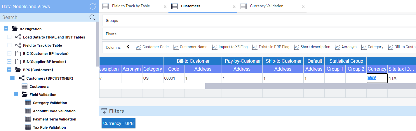 Dans notre exemple, nous avons ouvert feuille de calcul Currency Validation sous le modèle Customers.