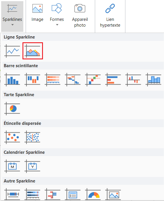 Cliquez sur Sparkline et sélectionnez le sparkline de zone sous Ligne Sparkline dans la liste.