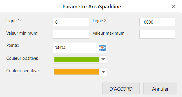 La formule area sparkline a la syntaxe suivante : =AREASPARKLINE(points, min, max, line1, line2, colorPositive, colorNegative) |