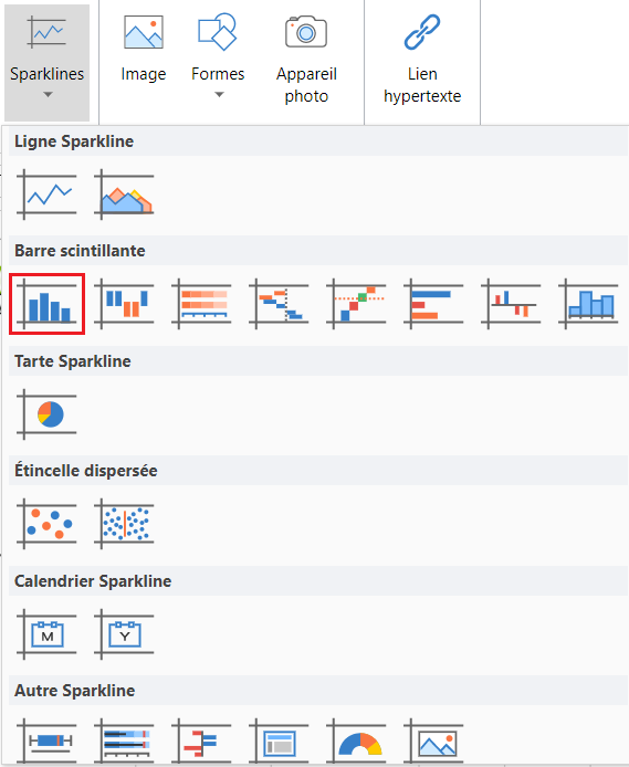 Cliquez sur Sparkline et sélectionnez le sparkline colonne sous Barre Sparkline dans la liste.