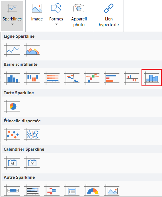 Cliquez sur Sparkline et sélectionnez le sparkline histogramme sous Barre Sparkline dans la liste.