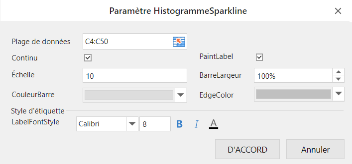 La formule de sparkline histogramme a la syntaxe suivante : =HISTOGRAMSPARKLINE(dataRange,continuous?,paintLabel?,scale?,barWidth?,barColor?,labelFontStyle?,labelColor,edgeColor?) |