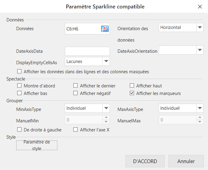 | Afficher les marqueurs | Indique si les marqueurs de données sont affichés pour chaque sparkline dans ce groupe de sparklines. |