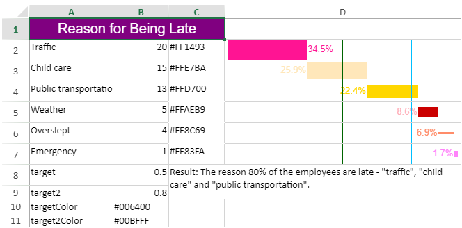 La formule sparkline de type pareto a la syntaxe suivante : =PARETOSPARKLINE(points, pointIndex, colorRange, target, target2, hightlightPosition, lable, vertical, targetColor, target2Color, labelColor, barSize) |