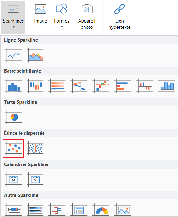Cliquez sur Sparkline et sélectionnez le sparkline d'étincelle dispersée sous Étincelle dispersée dans la liste.