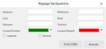 La formule de sparkline de variance a la syntaxe suivante : =VARISPARKLINE(variance, reference, mini, maxi, mark, tickunit, legend, colorPositive, colorNegative, vertical) |