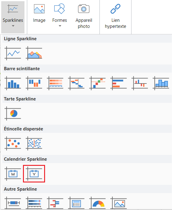 Cliquez sur Sparkline et sélectionnez le sparkline année sous Calendrier Sparkline dans la liste.