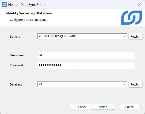Cliquez sur Fetch.. pour récupérer les informations de votre serveur SQL (instances) et de votre serveur de base de données.
