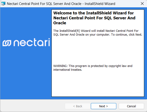 1. Exécutez l'application Nectari Central Point for SQL Server and Oracle.exe et cliquez sur Next.