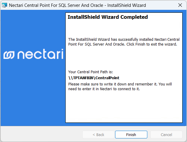 3. Cliquez sur Terminer. L'assistant d'installation indique le chemin de votre Central Point.