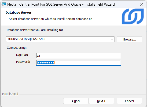 2. Dans la fenêtre Database Server, indiquez le serveur où la base de données de Nectari sera installée et fournissez les informations d'identification requises pour vous connecter à ce serveur puis cliquez sur Next.