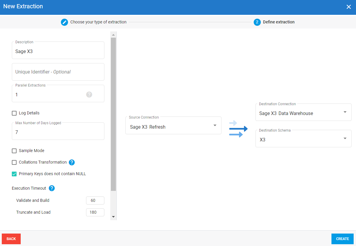 5. Sélectionnez la connexion source Refresh et la connexion de destination Data Warehouse (tel que décrit dans Configurer les connexions ).