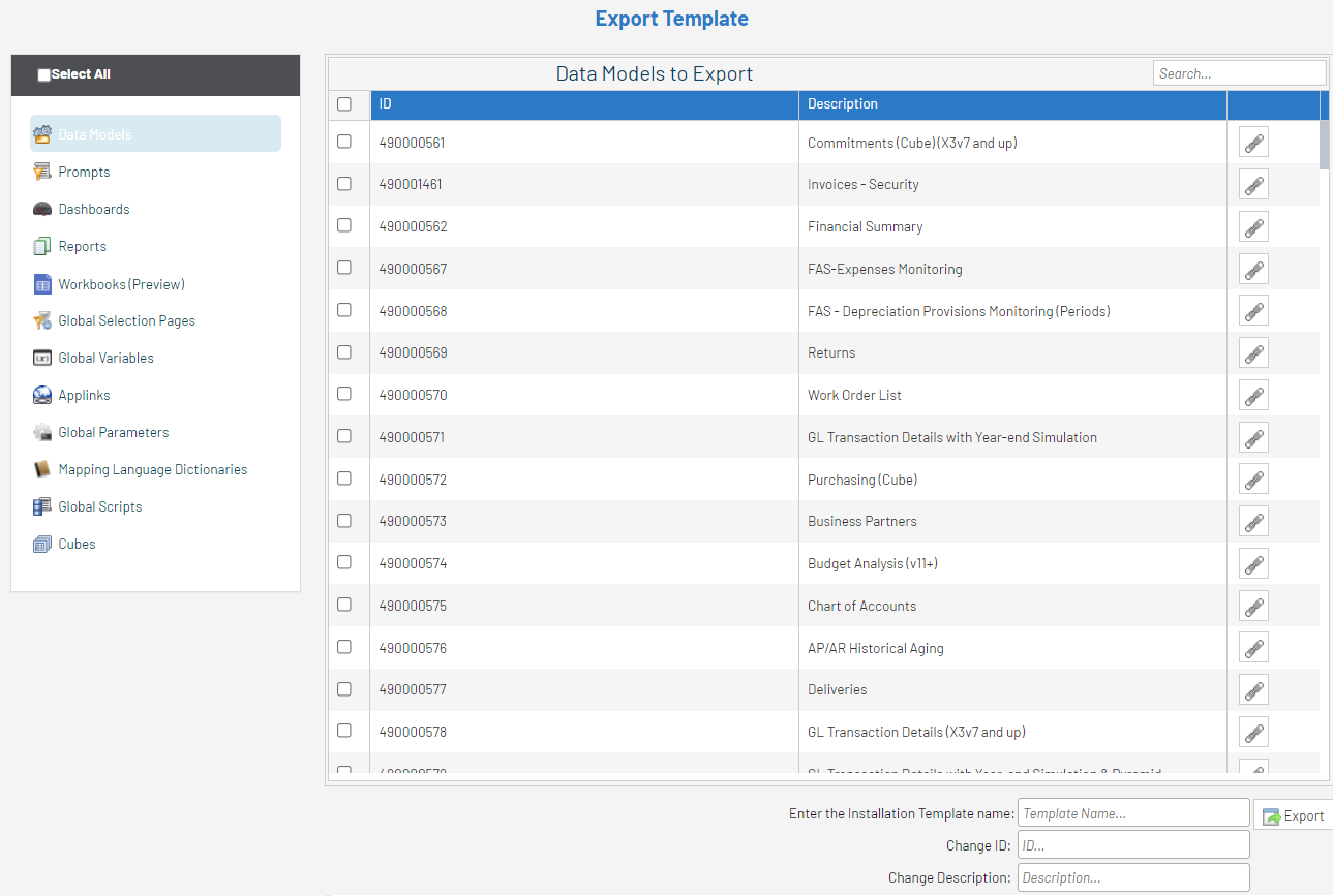 The Export Template option allows you to export any Nectari objects (Data Models, Views, Prompt, Global Parameters, etc.) to a zip file in order to be imported into any Nectari installation.