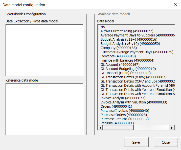 Workbook Configuration: This section will display any data model that is set using the Data Extraction tool, Pivot Table tool, or References Configuration tool.