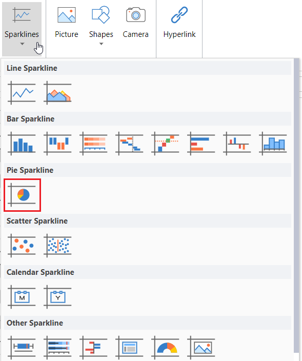 Click Sparkline and select the pie sparkline under Pie Sparkline from the list.
