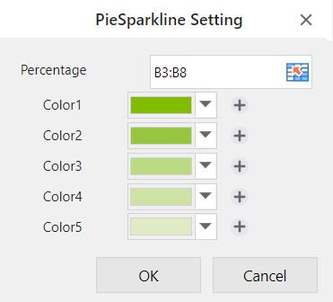 The pie sparkline formula has the following syntax: =PIESPARKLINE(Percentage,color1,color2,.....) |