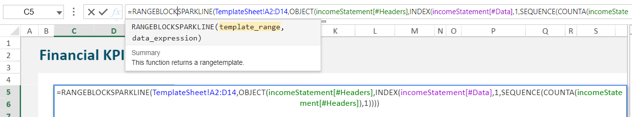 The RangeBlock sparkline formula has the following syntax: =RANGEBLOCKSPARKLINE(template_range, data_expression) Example of RangeBlock sparkline formula with the OBJECT, INDEX, and SEQUENCE functions used to create the sparkline shown in Step 5: =RANGEBLOCKSPARKLINE(TemplateSheet!A2:D14,OBJECT(incomeStatement[#Headers],INDEX(incomeStatement[#Data],3,SEQUENCE(COUNTA(incomeStatement[#Headers]),1)))) |