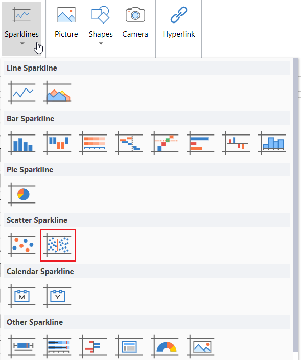 Click Sparkline and select the spread sparkline under Scatter Sparkline from the list.
