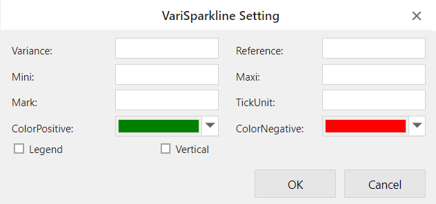 The variance sparkline formula has the following syntax: =VARISPARKLINE(variance, reference, mini, maxi, mark, tickunit, legend, colorPositive, colorNegative, vertical) |
