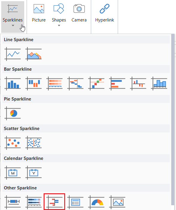 Click Sparkline and select the variance sparkline under Other Sparkline from the list.