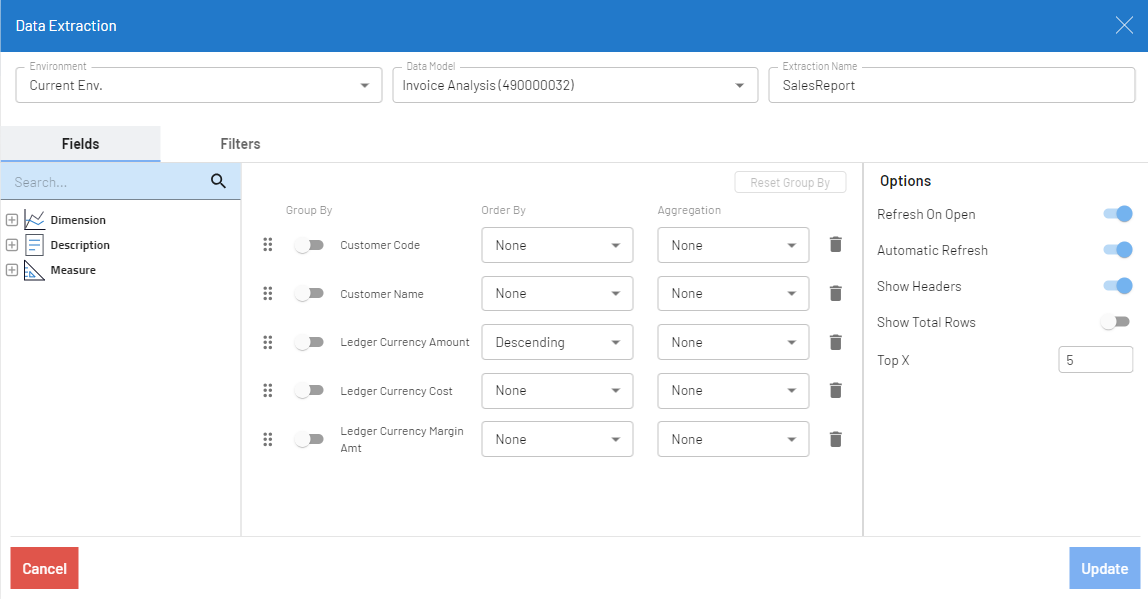 In Data Extraction, it is possible to replace the default column headers, which are usually auto-generated from field descriptions within the data model. Once a data extraction table is created with these customized headers, the changes are retained. Subsequent refresh actions on the data extraction do not revert these headers to their original data model auto-generated names, ensuring customizations remain intact.