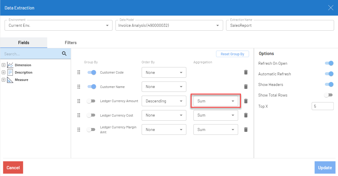 For each field, select whether the field will be part of the GROUP BY or will be aggregated. If the field is not selected to be grouped, a list of aggregation will be shown. If the field is selected to be grouped, the drop-down for aggregation will be hidden.
