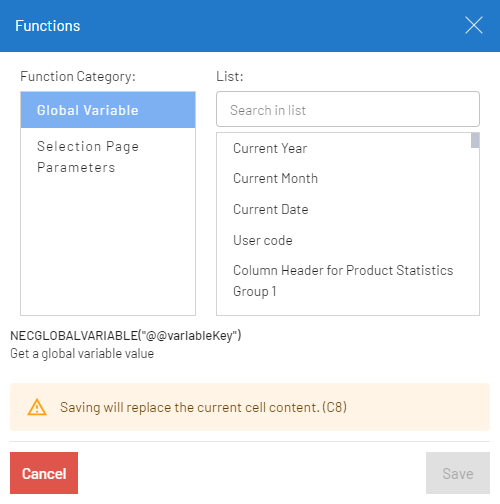 | =NECGLOBALVARIABLE("@@variableKey") | Function that is created within the selected cell when the user selects a Global Variable. |