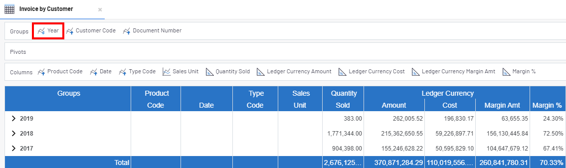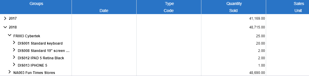 When data is grouped by one or more fields, you can expand/drill down (show) or collapse/drill up (hide) the grouped data.