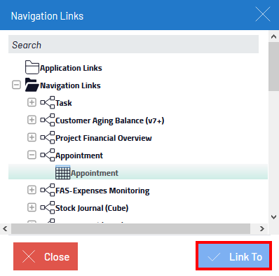 When using the Link To feature, Nectari presents a list of all the application and navigation links that are related to the selected value.