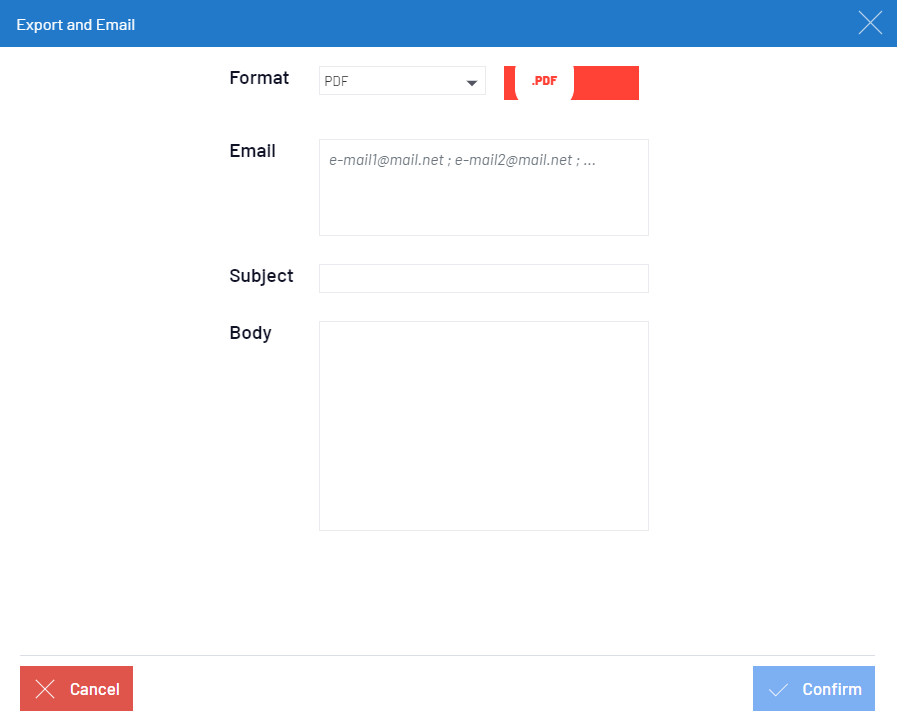 The Email option allows you to export a view in various file formats and send it by email in the same process. Nectari supports the following export formats—PDF, XLSX, XLS, CSV, HTML, XML, and PNG (for charts and dashboards only).