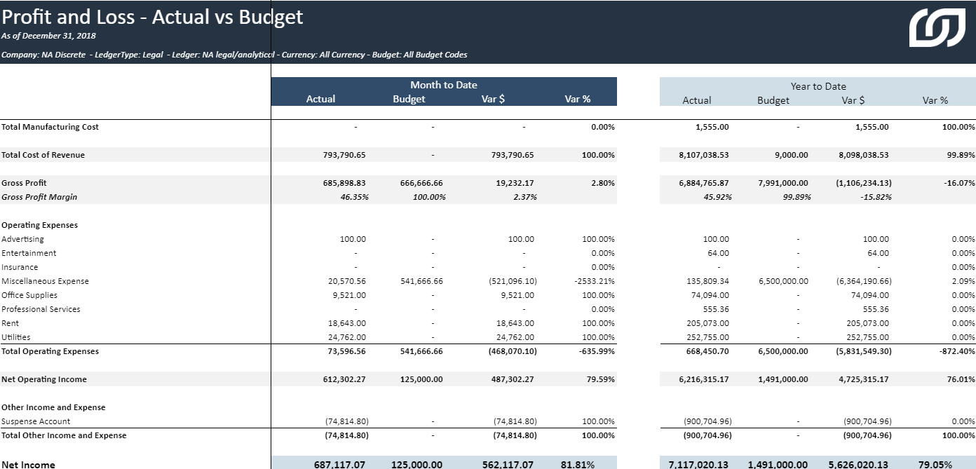 %: This column shows the variance in percentage for the actual vs budget. It is calculated as (Actual / Budget) * 100.