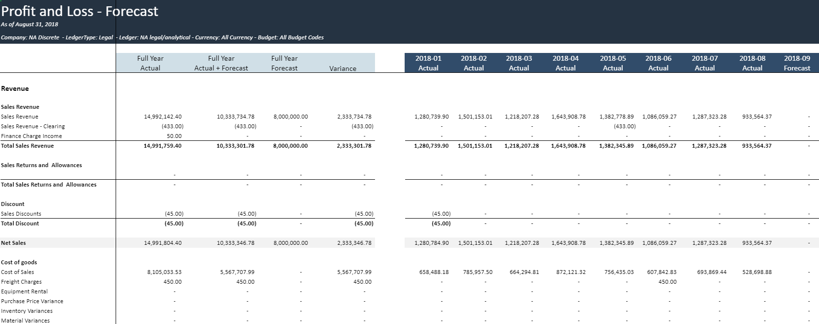 Full Year Actual + Forecast: Shows the combined actual and forecast financial performance of each P&L account.