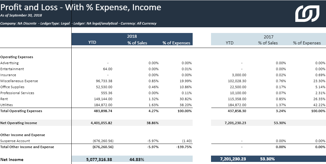 % of Expenses: Shows the percentage of total expenses that each P&L account represents. It is calculated as (YTD / Total Expenses) * 100.