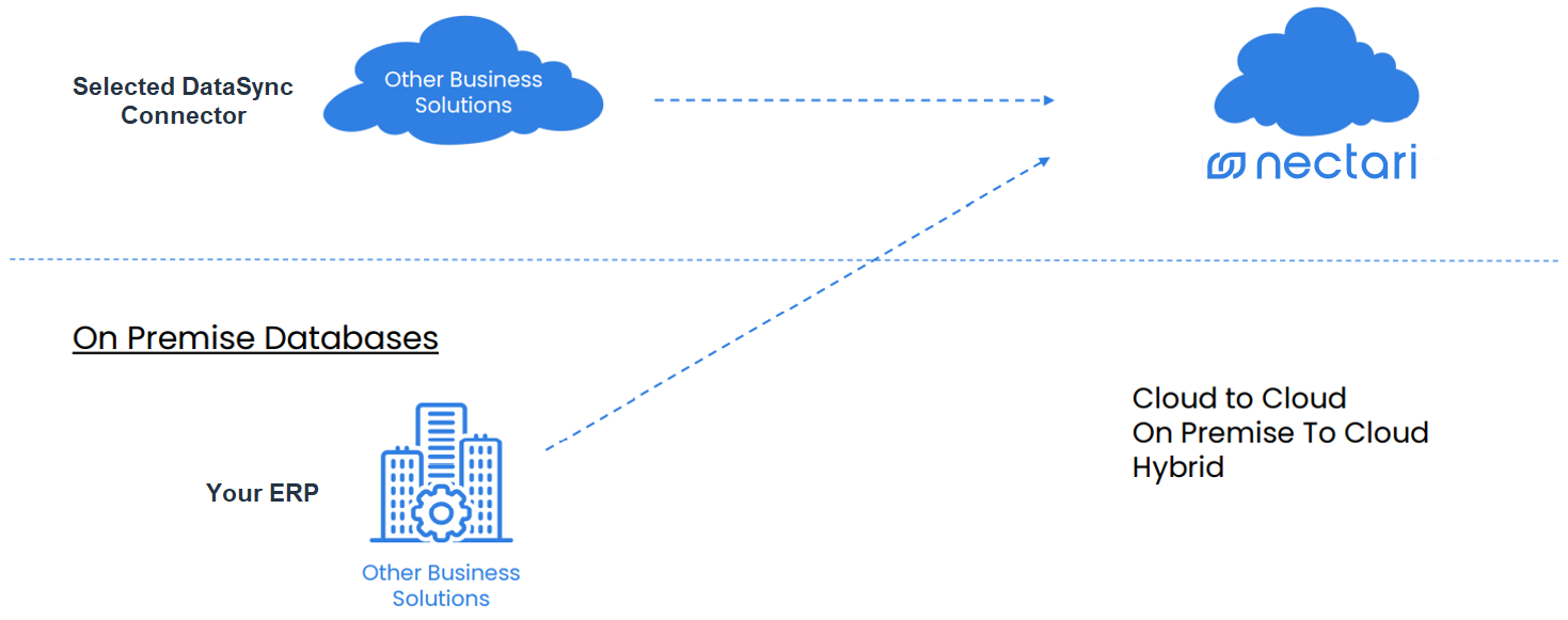 Nectari can be used in the Cloud or On Premise (locally). Nectari offers the possibility to synchronize your data in the Cloud using DataSync. Databases can be hosted On Premise or in the Cloud. Data can be synchronized in three different ways: